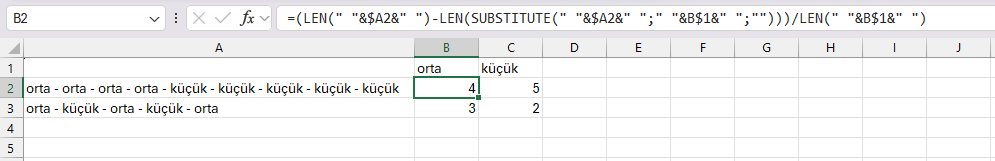 Merhabalar resimdeki gibi ben bir hücrenin icindeki aynı kelimenin kaç defa yazıldığını nasıl saydirabilirim.