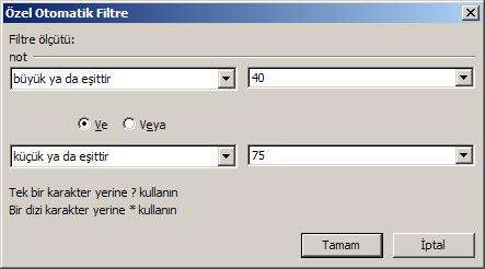 Açılan kutudan Filtre ölçütlerini giriniz (Sizin örneğinizde , eşit ve büyük 40 ; eşit ve küçük 75)
