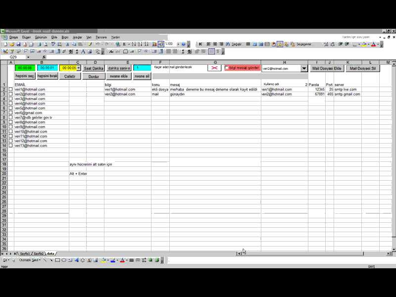 proğramın çalışması için @gmail adresi mutlaka olmalı zira ttnet @hotmail adresinden maail göndermiyor ama avea internet hattını bilgisayara bağladık orada @hotmail adresinden de mail gönderiyor.